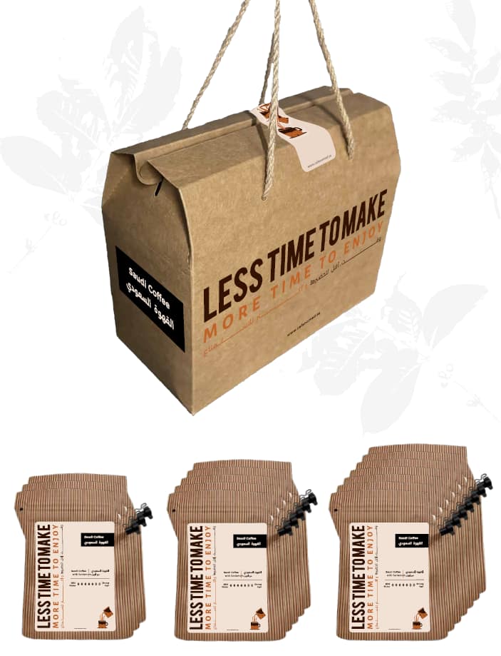 دلة صانعة القهوة سريعة التحضير هي منتج مبتكر حاصل على براءة اختراع عالمية. تم تصميمها وتصنيعها ككيس من ورق الكرافت يحتوي على مرشح داخلي، يضم 25 جرامًا من القهوة السعودية الطازجة المطحونة مسبقًا والممزوجة بالهيل والزعفران الطبيعي. تتميز القاعدة بنايلون رفيع جدًا وخالٍ من المواد الضارة، مما يسمح للدلة بالوقوف بشكل مستقيم تلقائيًا أثناء تحضير القهوة والاستمتاع بمذاقها الغني والمتوازن من القهوة السعودية الفاخرة.